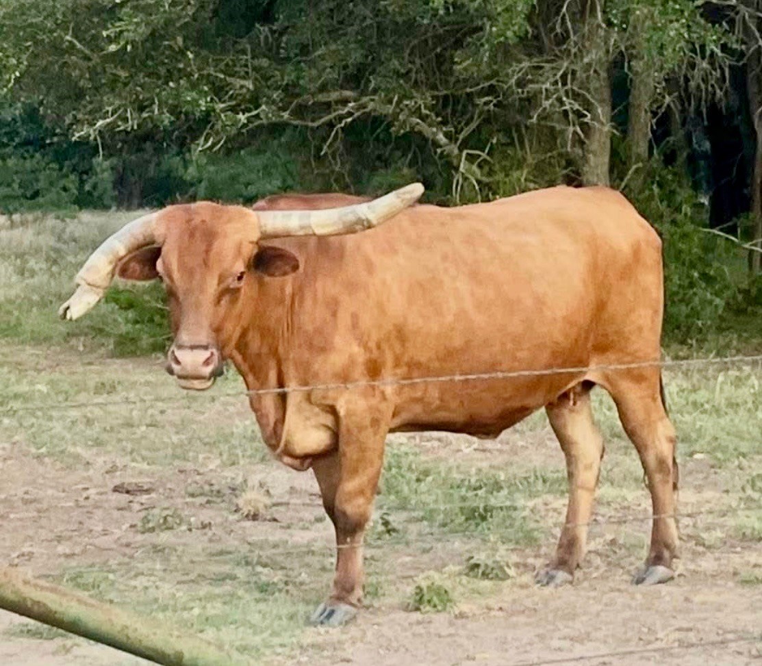 One of our favorite cows on the farm. Deep rich history of survival with this sweet but strong cow. She's built very well with a very stout frame that sits on some thick boned legs. She's the grandmother of the 95" true black bull named Dark Dust. Her 2025 bull calf out of Goose is probably the biggest bodied calf coming out of a cow that I have seen in a longhorn and we're keeping an eye on him...he's looking great. Super cow that is here to stay and is the backbone and heart of this farm.
